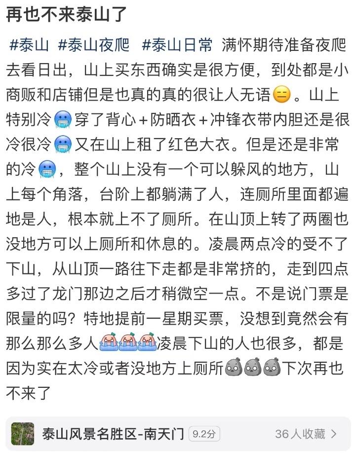 据游客反映,国庆第一天的泰山夜爬,“一点不叫爬山,全是人,现场没工作人员指引,到处脏乱差,地面,洗手间简直惨不忍睹,上去没人管,下去更加没人管,安全隐患巨大。”网友不禁发问:“不是说门票是限量的吗?特地提前一星期买票,怎么会有那么多人?”