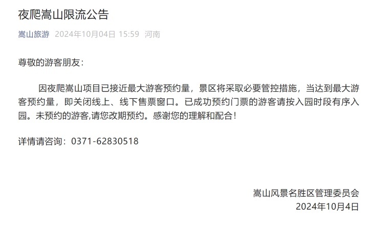 10月4日,据“嵩山旅游”, 因夜爬嵩山项目已接近最大游客预约量,景区将采取必要管控措施,当达到最大游客预约量,即关闭线上、线下售票窗口。