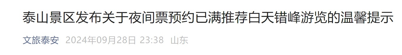 9月28日,据“文旅泰安”发布,截至9月28日上午11:00,泰山红门徒步游览路10月1、2、3、4日16:00-23:00的门票预约已满,推荐中外游客白天入园、错峰游览。